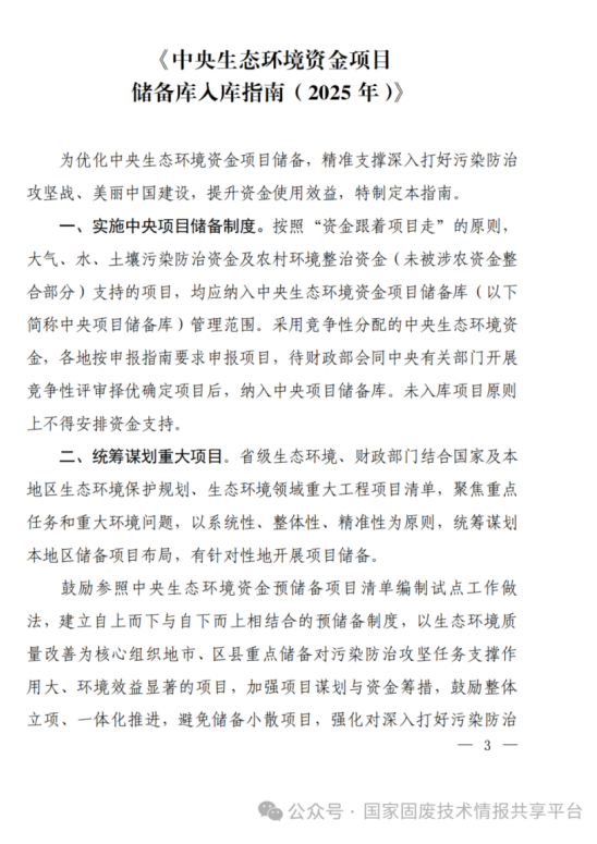 為深入貫徹黨中央、國(guó)務(wù)院有關(guān)決策部署,提高預(yù)算安排的科學(xué)性、規(guī)范性和前瞻性,進(jìn)一步充分發(fā)揮中央生態(tài)環(huán)境資金項(xiàng)目?jī)?chǔ)備庫(kù)作用,對(duì)持續(xù)深入打好污染防治攻堅(jiān)戰(zhàn)和推進(jìn)美麗中國(guó)建設(shè)形成有力支撐,根據(jù)《生態(tài)環(huán)境領(lǐng)域中央和地方財(cái)政事權(quán)和支出責(zé)任劃分改革方案》《中央生態(tài)環(huán)保轉(zhuǎn)移支付資金項(xiàng)目?jī)?chǔ)備制度管理暫行辦法》《中央生態(tài)環(huán)境資金項(xiàng)目管理規(guī)程》以及生態(tài)環(huán)境資金管理辦法等有關(guān)文件,生態(tài)環(huán)境部、財(cái)政部修訂了《中央生態(tài)環(huán)境資金項(xiàng)目?jī)?chǔ)備庫(kù)入庫(kù)指南(2025年)》。(來(lái)源:農(nóng)村污水)